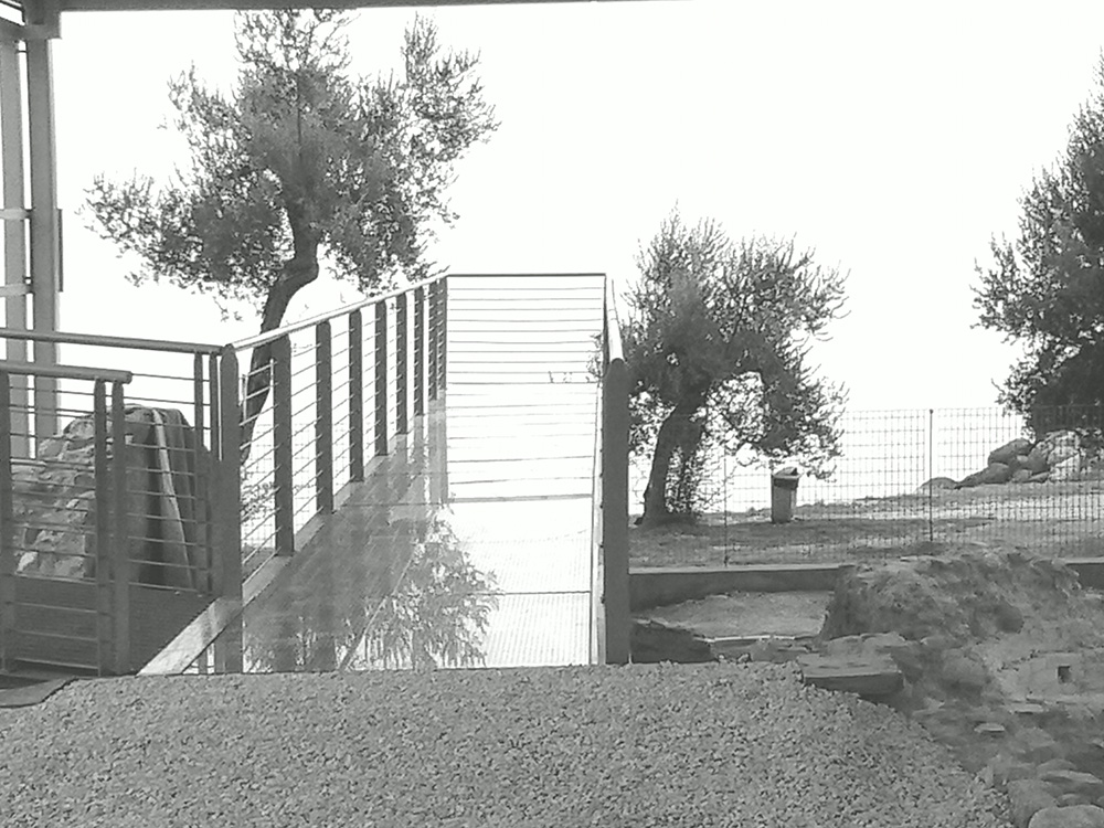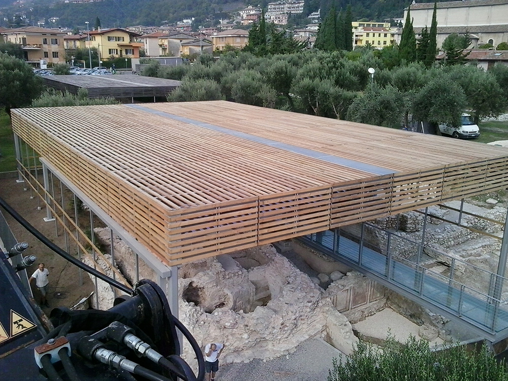 Struttura realizzata con abbinamento di metallo, legno e vetro per la copertura dei resti di una villa romana